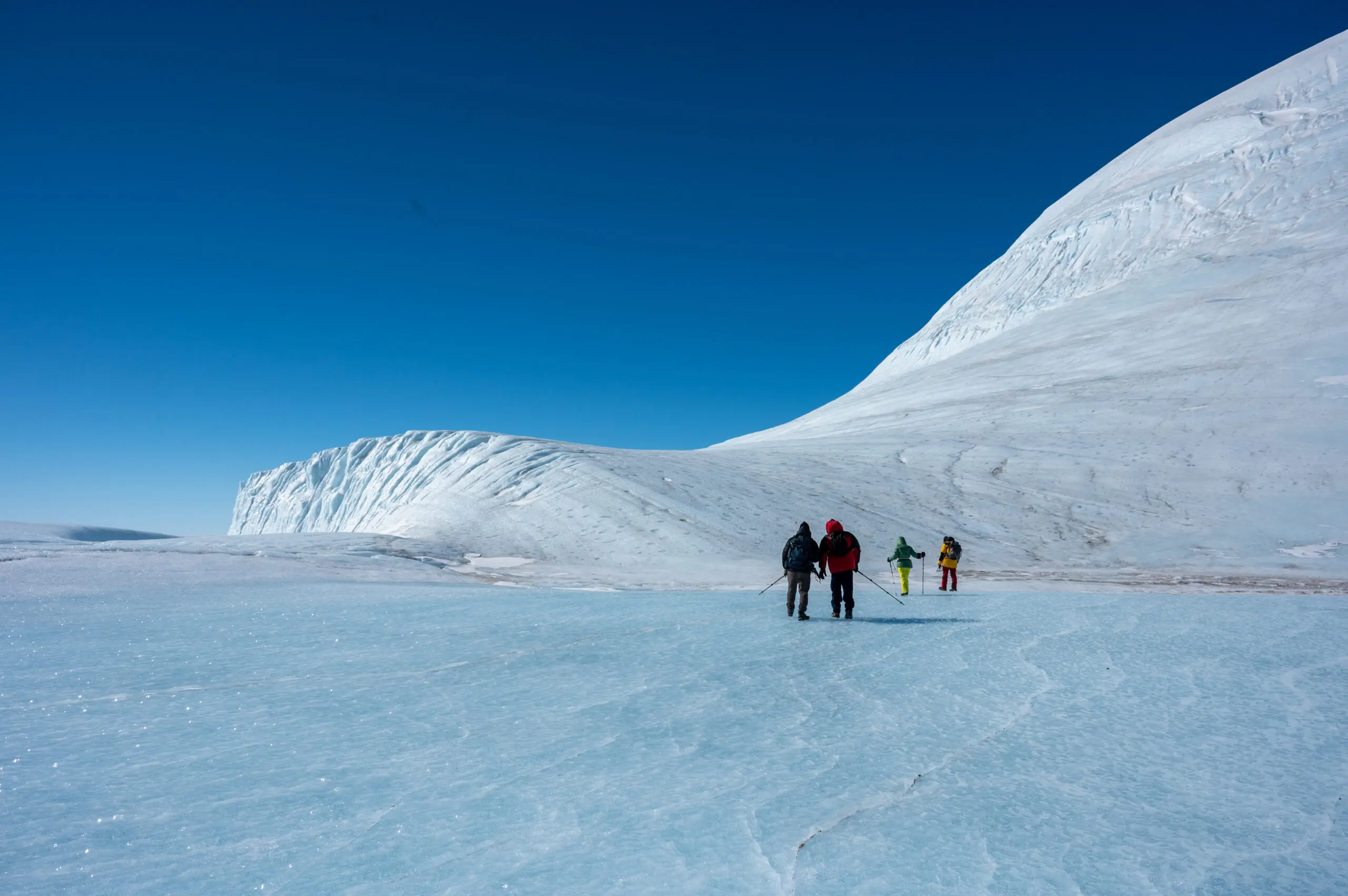 We board our purpose-built Toyota Hilux and begin your journey into the pristine white wilderness of the Antarctic interior. Travelling across the snow and ice, to reach an astonishing natural artwork: an Antarctic Ice Wall. With the support of our experienced polar guide, you’ll step out onto the striking blue ice and witness the sheer scale and silence of this remote frontier.