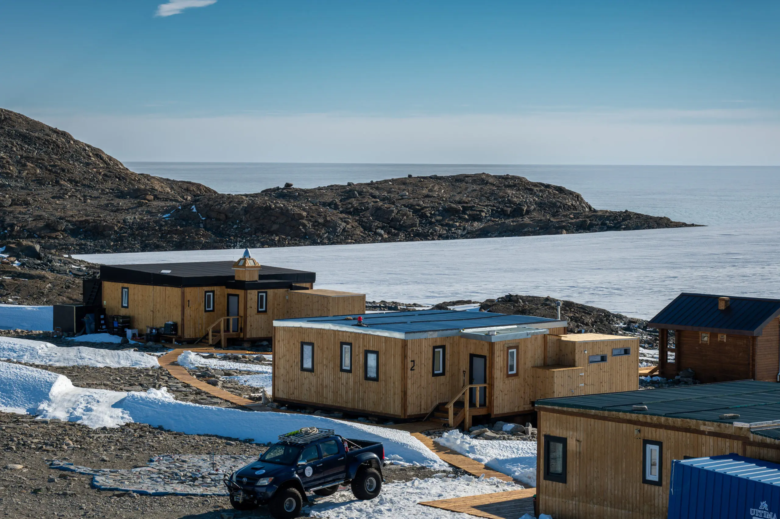 Stunning wooden decks out front offer a unique setting for contemplation in the Antarctic sunshine.