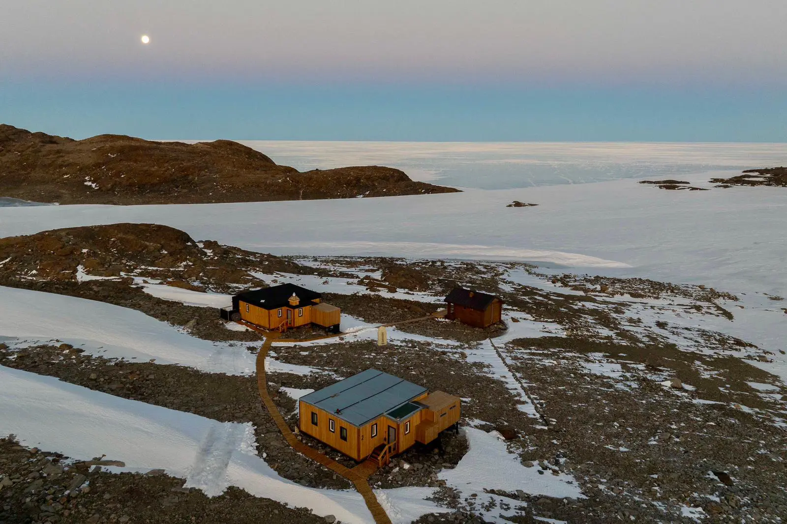 Nestled in our valley are three Scandinavian-style timber cabins – plus a traditional “Banya” sauna – gazing out towards the continental ice shelf.